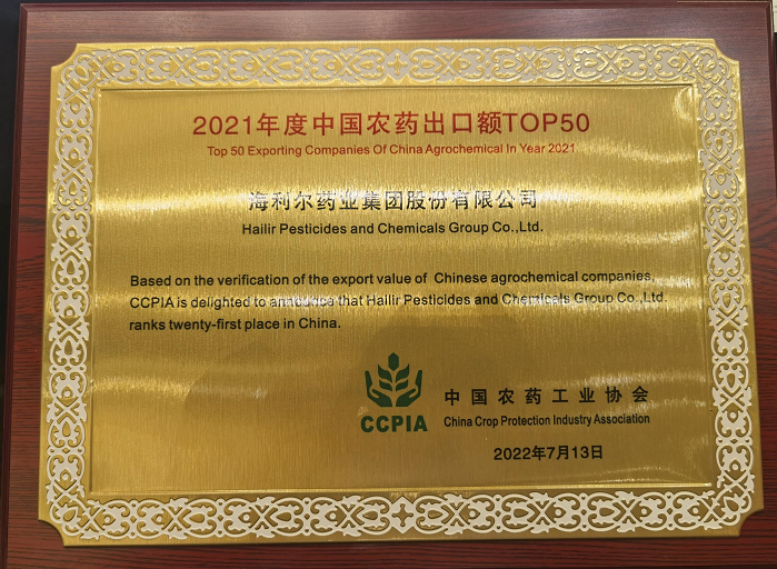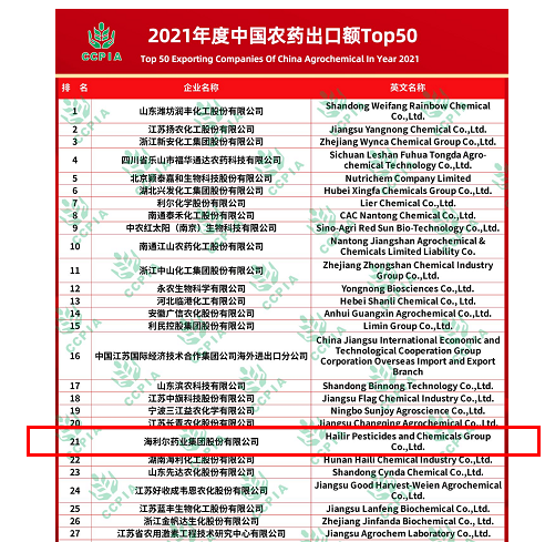 7月13日,在湖南常德举行的第九届中国植物保护产品国际贸易发展论坛暨国际贸易委员会工作年会上,中国农药工业协会国际贸易委员会发布了2021年度中国农药出口额TOP50榜单,betway西汉姆联官方网站位居榜单第21位。
