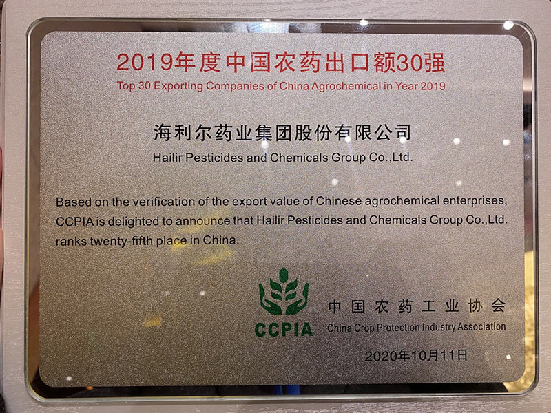 2019年betway西汉姆联官方网站农药出口再创佳绩。10月11日,由中国农药工业协会主办的第二十届全国农药交流会上,betway西汉姆联官方网站荣获2019年中国农药出口额30强。