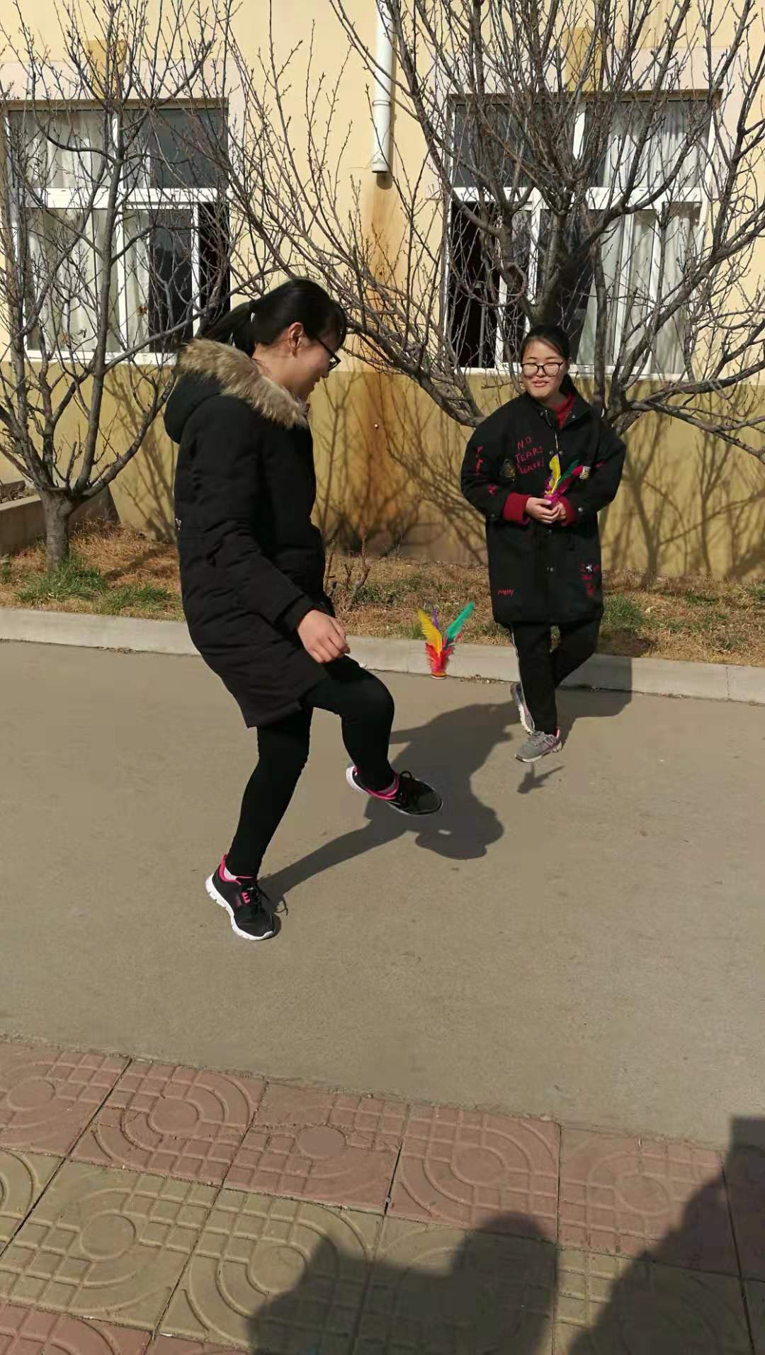 青岛的风可真是无处不在,但依旧阻挡不了女生们展现踢毽子的实力。