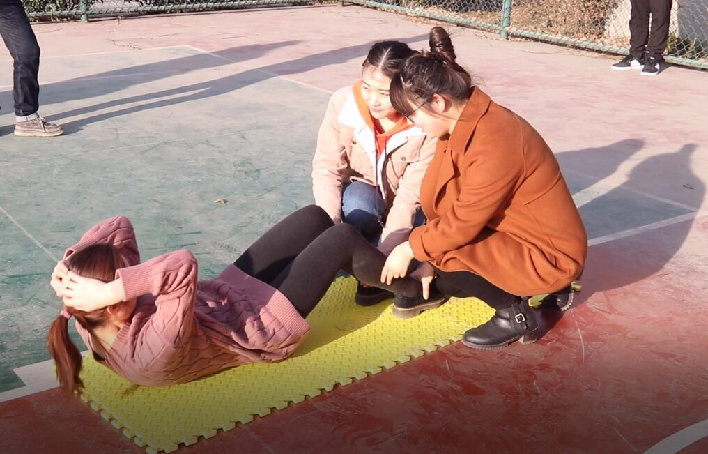 最后一关仰卧起坐让女生憋红了脸,卯足了劲,为团队争分夺秒。
