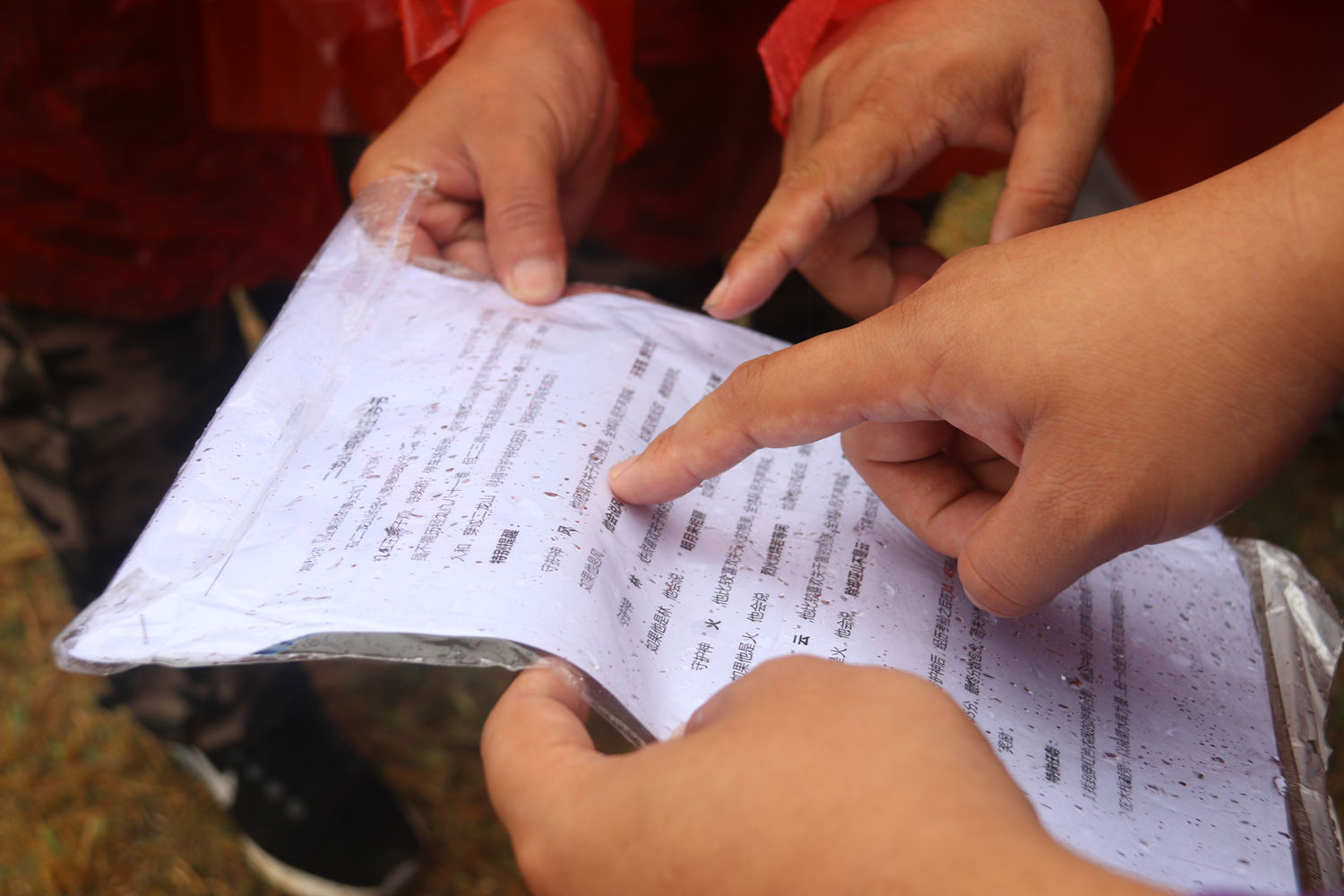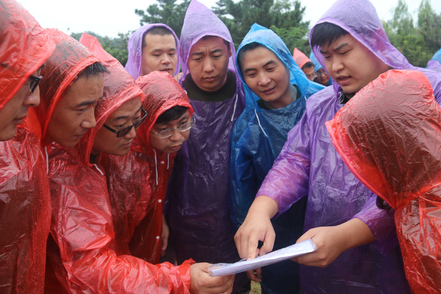 定向任务只有一张纸、一张图,在制定地点完成指定任务后方可进入下一关,没关任务都要所有队员协作完成,图为:队员们聚集在一起查看任务要求