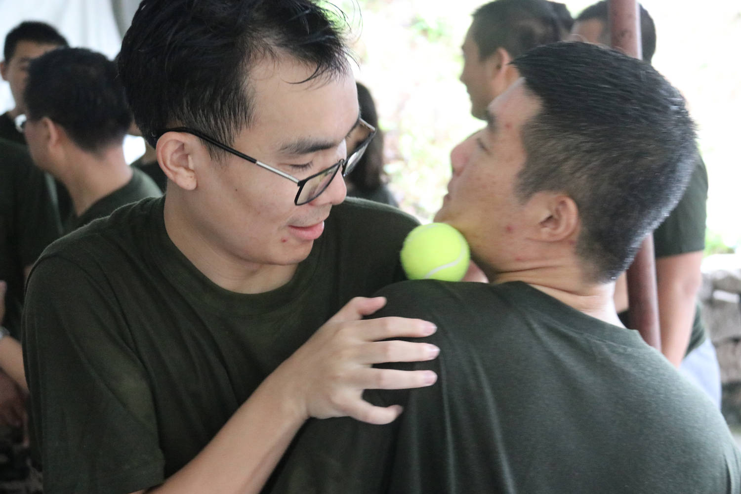 第三关肩部和颈部夹球完成全体队员间的传递,完成后聚集在一起喊出队伍口号