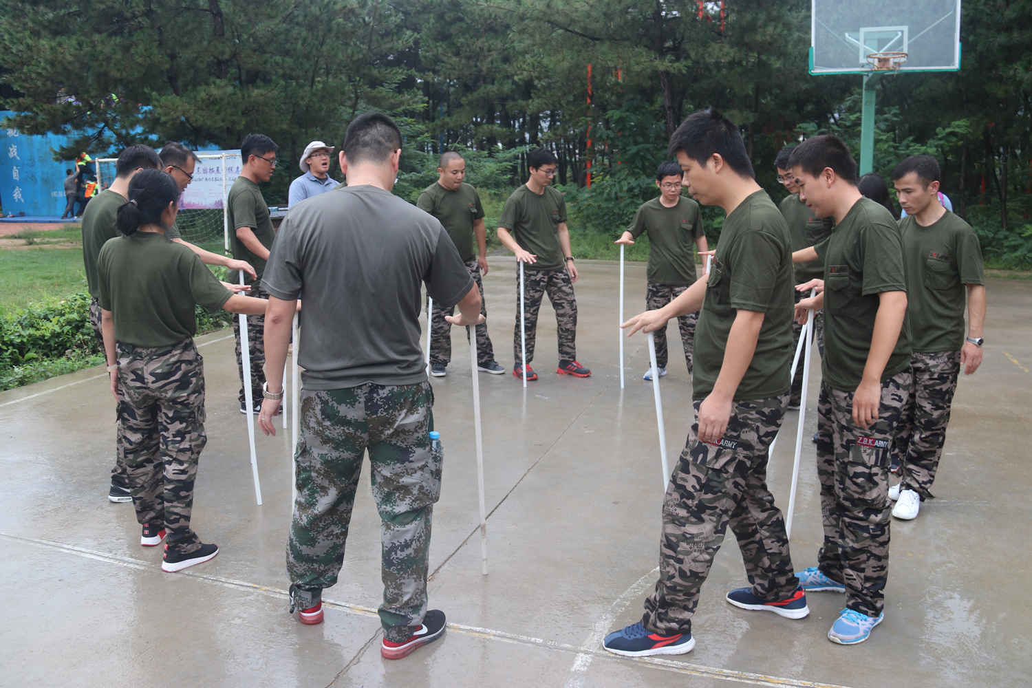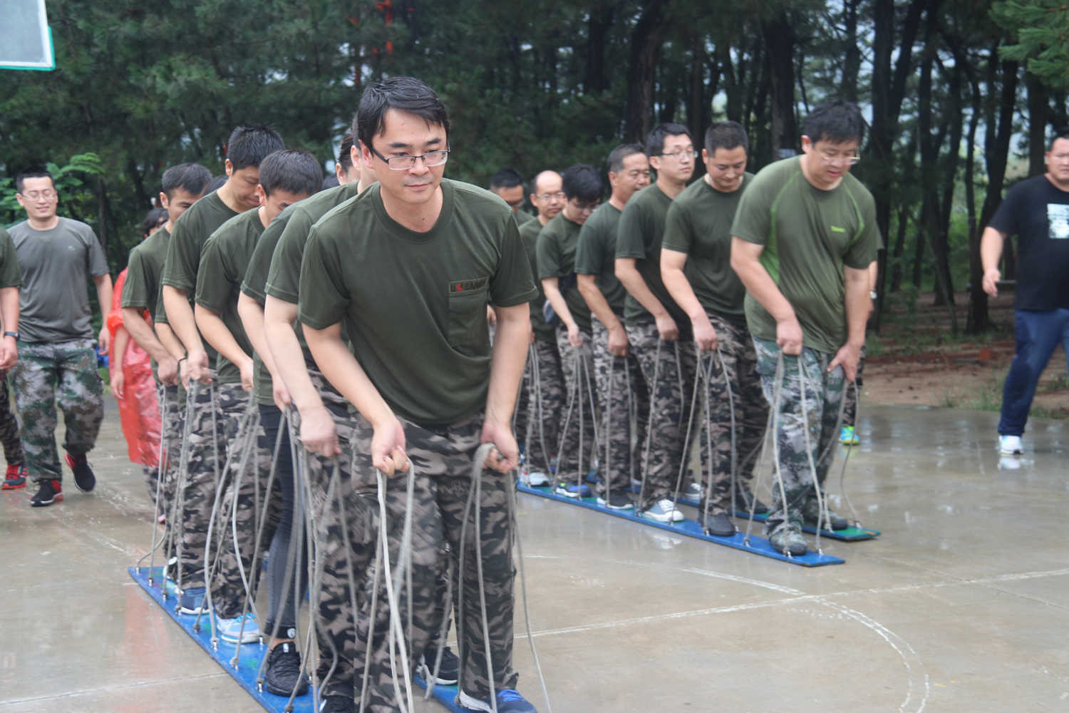 团队列车,考验队员们协调一致的能力,分三个层次,第一层次为正常模式,第二层次,偶数的同事与奇数的同时满对面站立完成前进,第三个层次,不允许发出任何声音,考验团队默契。
