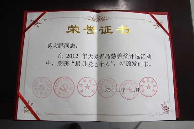 12月30日晚,青岛市慈善总会2013年慈心童行元旦慈善晚宴在黄岛饭店举行。会上对2012年度“大爱青岛慈善奖”评出的在助医、助学、安老、慈孤、赈灾、义工服务等方面,做出突出贡献的27个集体和50名爱心个人进行了表彰。betway西汉姆联官方网站副总裁葛大鹏荣获“最具爱心个人”荣耀称号。