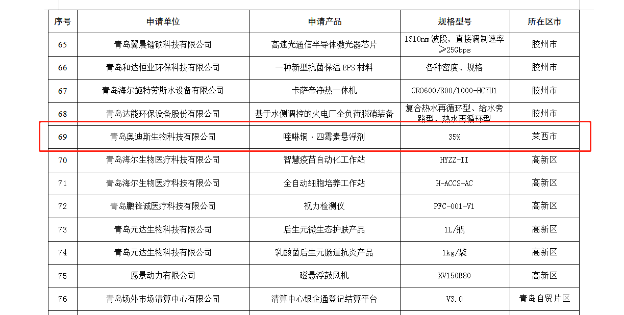 近日,青岛市工业和信息化局公布了青岛市创新产品推荐目录(2023年度第一批)名单,betway西汉姆联官方网站子公司奥迪斯生物生产的35%喹啉铜·四霉素悬浮剂(阿尔达)产品成功入选。