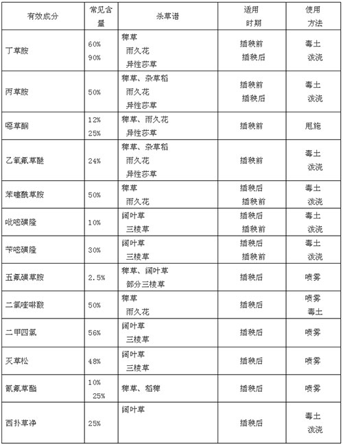 浙江省稻田杂草优势种为稗草、千金子、双穗雀稗、异型莎草、空心莲子草、鸭舌草、矮慈姑、节节菜、牛毛毡和丁香蓼等。