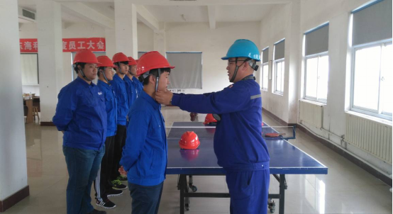 二车间主任刘春辉为新员工佩戴安全帽